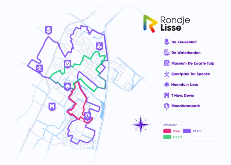Die Rundwanderung durch Lisse besteht aus drei Wanderwegen, die durch verschiedene Teile von Lisse führen. Der rosa Weg ist 3 Kilometer lang, der grüne Weg 5,5 Kilometer und der violette Weg 13 Kilometer.