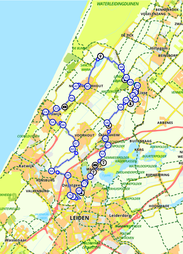 Die Route führt Sie an besonderen Orten vorbei, die die Geschichte des Goldenen Zeitalters und der Perückenzeit erzählen; der Zeit, als Holland das reichste Land der Welt war. Wohlhabende Regenten und Kaufleute wollten im Sommer der Stadt entfliehen und bauten Landhäuser auf dem sandigen Boden der alten Dünenreihe hinter der Küste. Den Sommer in der freien Natur verbringen, nicht allzu weit von Haarlem, Den Haag oder Leiden entfernt, das war die Idee.