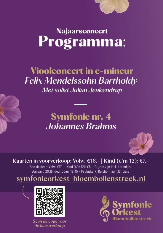 Het belooft een prachtig concert te worden, waarin het vioolconcert van Mendelssohn ten gehore zal worden gebracht met de veelbelovende jonge solist Julian Jeukendrup (2006). Julian is een uiterst talentvolle violist die al vele prestigieuze muziekprijzen won, en sinds 2024 aan het conservatorium van Amsterdam studeert. Hij was al te horen in een groot aantal concerten, festivals en optredens in Nederland en daarbuiten, en hij was ook optelevisie te zien in bijvoorbeeld het Nieuwjaarsconcert van het NBE en bij Podium Witteman.