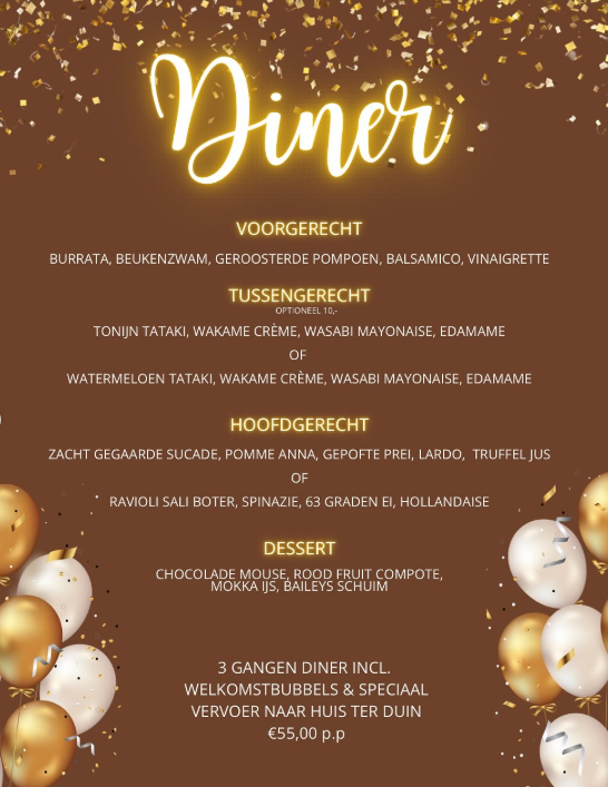 We gaan er echt een fantastische avond van maken. In je mooiste outfit wordt je ontvangen met een heerlijk glas bubbels waarna je naar een opgedekte tafel brengen. Nicky van de Kuyp zorgt met haar knalgave stem voor het entertainment. Onze keuken brigade staat klaar om een heerlijk 4 gangen diner te serveren. Ronde de klok van 21.00 uur wordt u geheel in stijl met paard en wagen naar Huis ter Duin gebracht.
