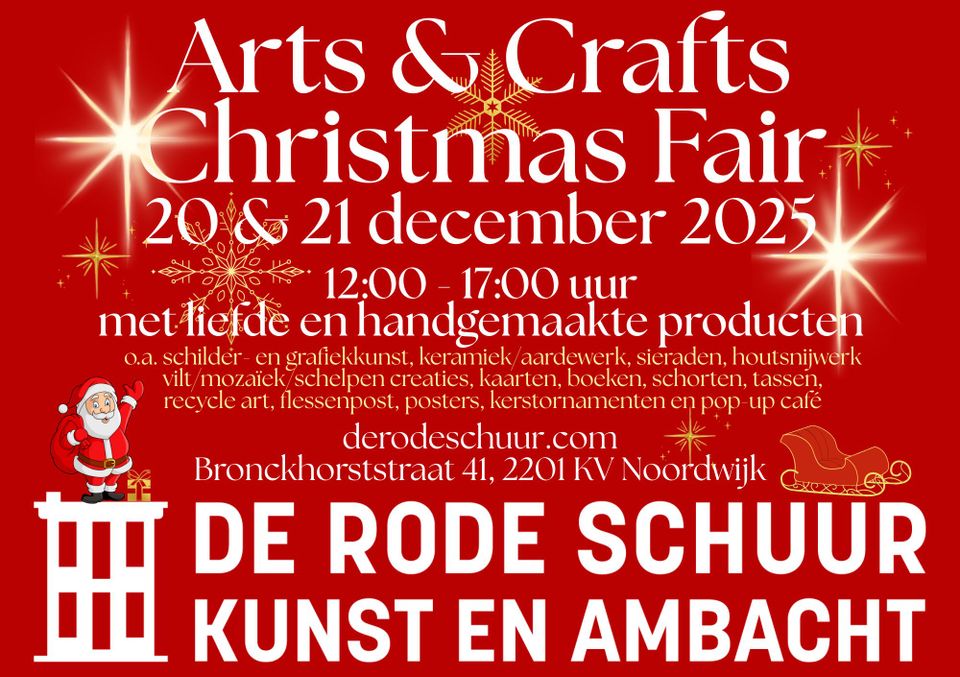 De Rode Schuur organiseert voor de derde keer een Arts & Crafts Christmas Fair en dit jaar zijn er nieuwe deelnemers bij gekomen. We hebben kunstenaars, cursisten, hobbyisten, creatievelingen, familie en vrienden die bij elkaar komen om er weer een gezellige Arts & Crafts Christmas Fair (kerstmarkt) van te maken en net als de afgelopen 2 jaren is alles met de hand & liefde gemaakt. Je vindt o.a. schilder- en grafiekkunst, keramiek/aardewerk, sieraden, houtsnijwerk vilt/mozaïek/schelpen creaties, kaarten, boeken, schorten, tassen,