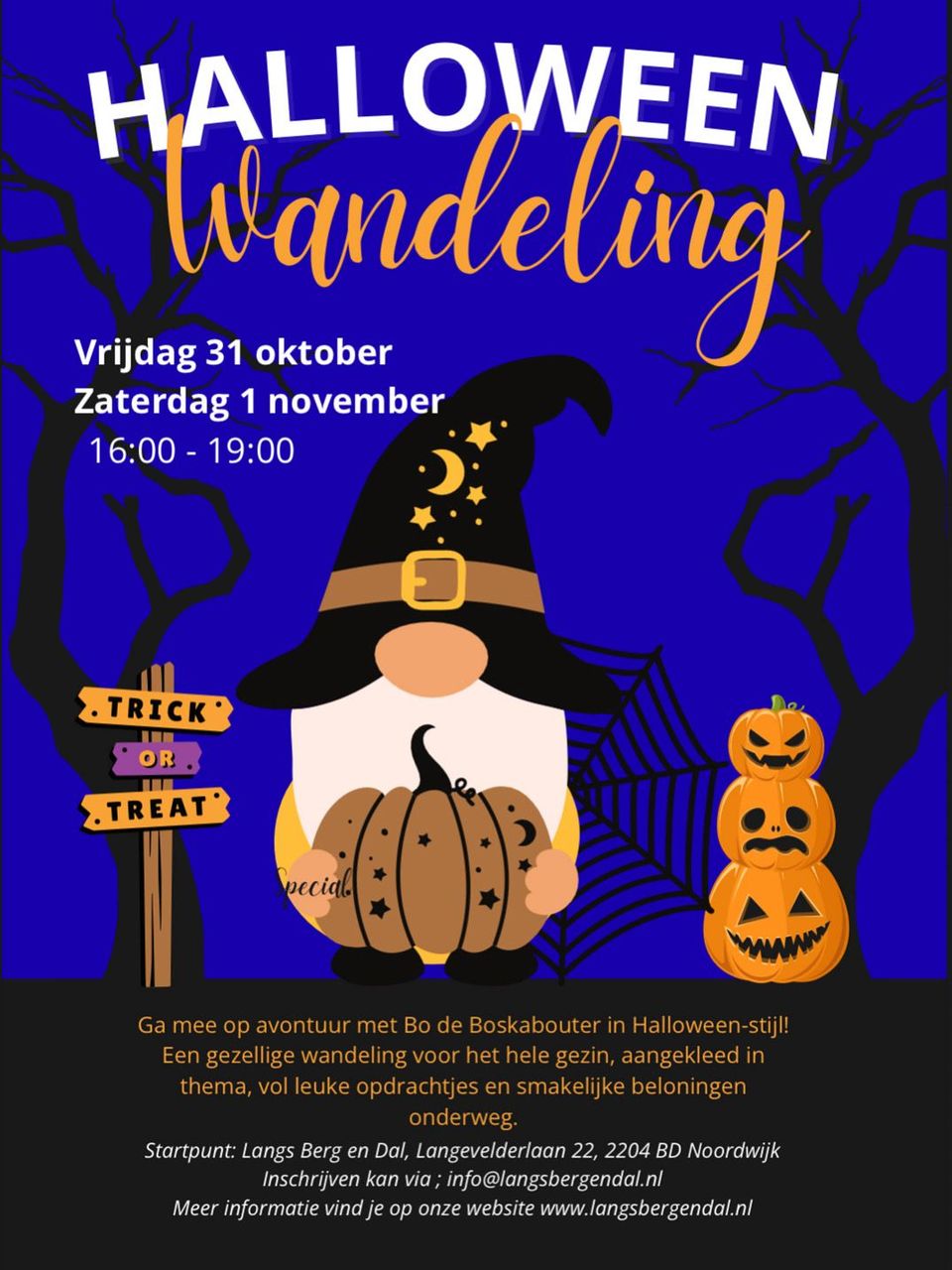 Ga mee op avontuur met Bo de Boskabouter tijdens de Halloweenwandeling bij Langs Berg en Dal! Op vrijdag 31 oktober en zaterdag 1 november tussen 16:00 en 19:00 uur verandert het bos rondom Langs Berg en Dal in een magisch Halloween bos. Wandeling duurt ongeveer een uur
