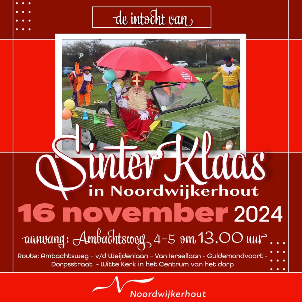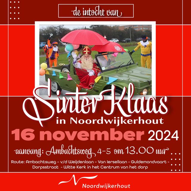 De Sint wordt -volgens de laatste berichten vanuit Spanje- verwacht aan de Ambachtsweg 5 (terrein van Weijers en De Koning) in Noordwijkerhout. Hier hoopt hij veel kinderen te kunnen begroeten en zal hij worden ontvangen door de burgemeester en de kinderburgemeester. Vervolgens zal hij samen met zijn pieten verder reizen naar het centrum van Noordwijkerhout rondom De Witte Kerk’. Daar maken we er nog een gezellig Sinterklaasfeest van!