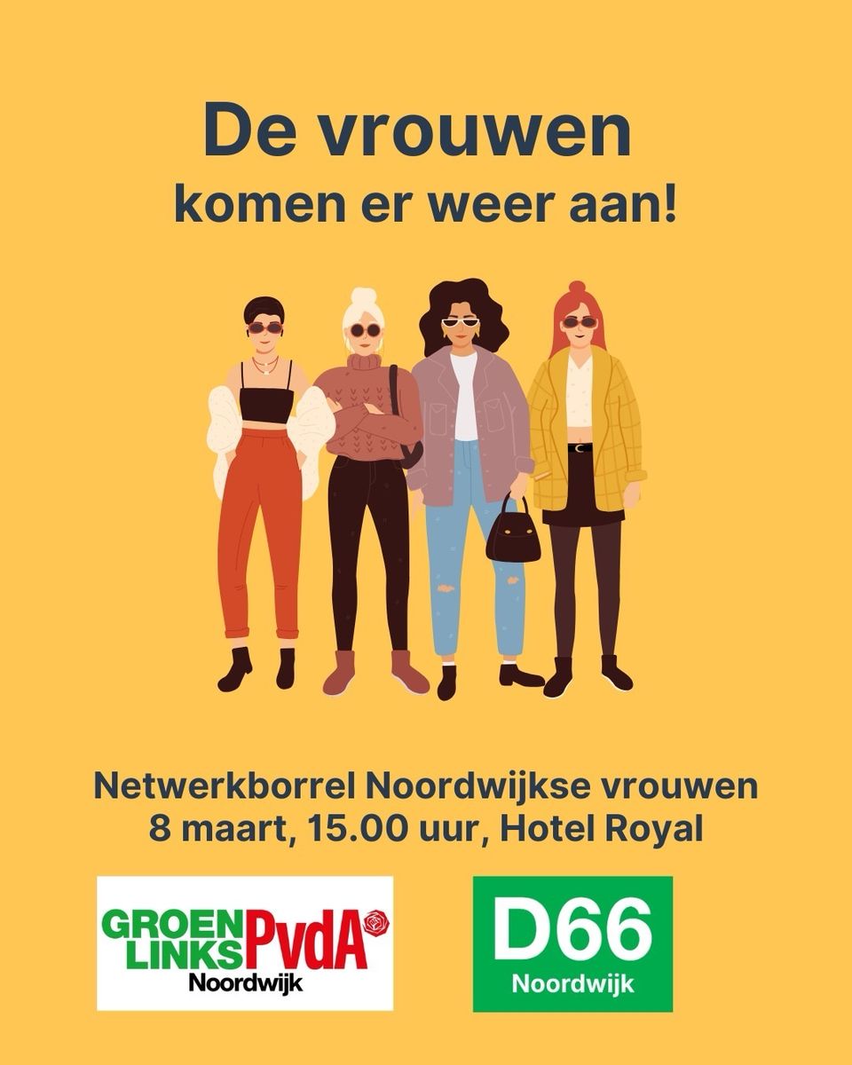 Een moment om elkaar te leren kennen, krachten te bundelen en het begin te maken van een stevig vrouwennetwerk in Noordwijk. In de afgelopen honderd jaar hebben in Noordwijk slechts 2 vrouwelijke wethouders in het college gezeten. Dat kan echt anders. Deze vrouwenborrel is de eerste stap naar regelmatige bijeenkomsten waarin we de stem van vrouwen laten klinken — krachtig, zichtbaar en solidair, een initiatief van Lisa Mertens-Dol (D66) en Martha Baalbergen (GroenLinks-PvdA). Waar: Hotel Royal, Voorstraat 76, Noordwijk Wanneer: zondag 8 maart vanaf 15.00 uur Ben je erbij? Stuur een berichtje naar marthabaalbergen@kpnmail.nl