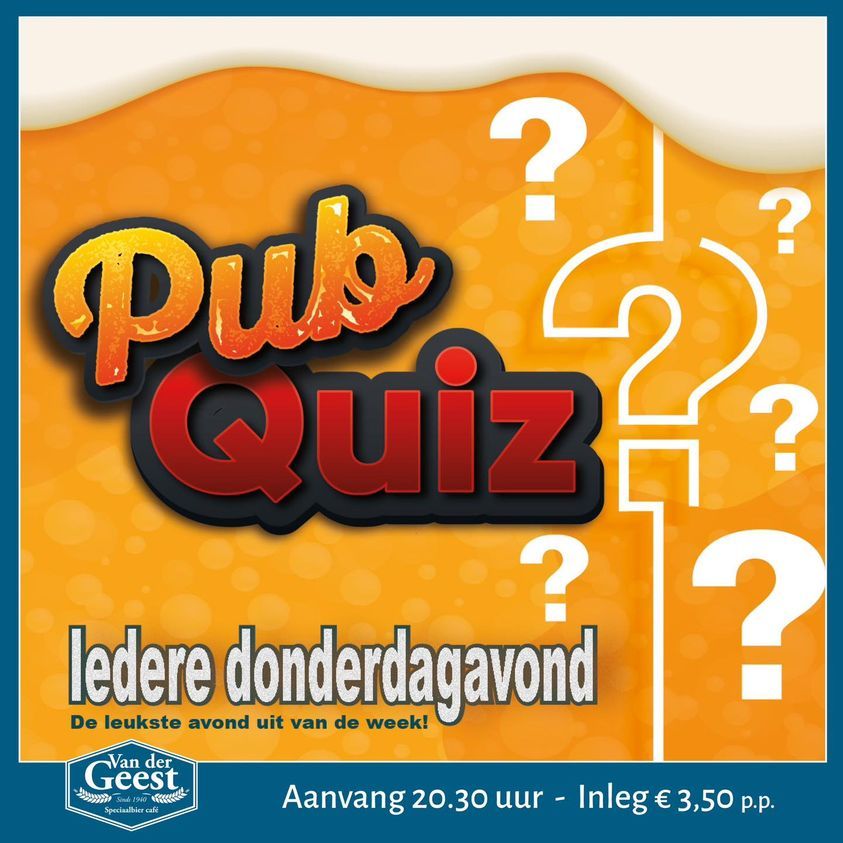 Donderdagavond, leukste avond van de week! Iedere donderdagavond ben je welkom bij Café Van der Geest voor een gezellige PubQuiz. Schrijf je in met een team (2-6 personen). Voor het team dat als eerste, tweede of derde eindigt is er een leuke prijs.