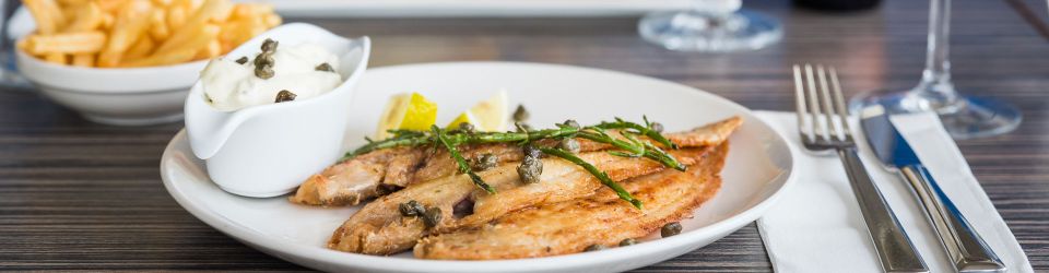 Bij mooi weer zit je heerlijk op het zonovergoten terras, waar je kunt genieten van één van de heerlijke visgerechten en een goed glas wijn.