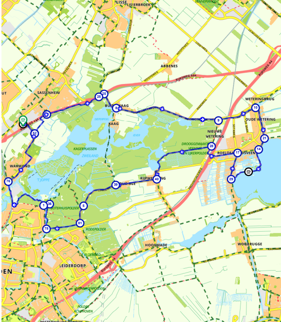 Je start je fietstocht in het gezellige centrum van Noordwijkerhout. Vanuit hier fiets je door de uitgestrekte polders in de richting van Lisse en verder naar de Kagerplassen. Deze schitterende plassen kleuren op mooie zomerdagen wit door de vele zeilbootjes, maar ook op de fiets is het hier goed toeven. Trap lekker door en geniet van het mooie uitzicht. Verder kun je hier genieten van een stukje Oer-Hollandse cultuur met molens en kaasboerderijen.